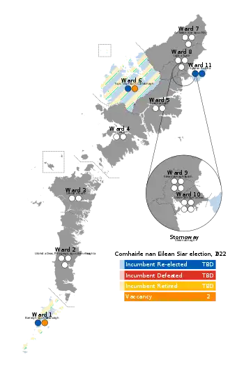Elections to Comhairle nan Eilean Siar (Scottish Gaelic for 'Council of the Western Isles') took place on 5 May 2022 on the same day as the 31 other Scottish local government elections. The election will be the first to use the nine wards created under the Islands (Scotland) Act 2018 which allowed for single and dual member wards, with 29 councillors being elected. Each ward elected either 2, 3 or 4 members, using the Single Transferrable Vote electoral system, a form of proportional representation.[2] Following a boundary review the number of wards will increase from nine to 11 while the number of councillors elected will fall from 31 to 29.
