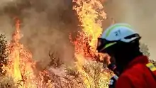 Aerial water bombers dropped 10,000 litres (2,200 imp gal; 2,600 US gal) of fire retardant on the fire fronts to stop the progress of the fire.[26] It had been reported that so far only four firefighters were injured, one fire appliance overturned and one was burnt.[28] Three thousand buildings had been saved.[28]