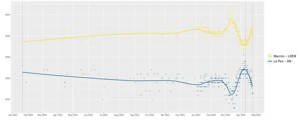 The 2022 French presidential election was held on 10 and 24 April 2022. As no candidate won a majority in the first round, a runoff was held, in which Emmanuel Macron defeated Marine Le Pen and was re-elected as President of France.[1] Macron, from La République En Marche! (LREM), had defeated Le Pen, leader of the National Rally, once already in the 2017 French presidential election, for the term which expired on 13 May 2022. Macron became the first president of France to win a re-election bid since Jacques Chirac won in 2002.[2]