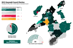 The 2022 Gwynedd Council election took place on 5 May 2022[1] to elect 69 members from 65 wards to Gwynedd Council. On the same day, elections were held to the other 21 local authorities and to community councils in Wales as part of the 2022 Welsh local elections. The previous Gwynedd all-council election took place in May 2017 and future elections will take place every five years.