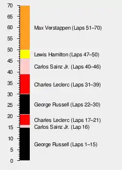 Verstappen pitted again, with Russell and Leclerc making reactionary pitstops. Verstappen undercut Russell, while Leclerc pit onto the slower hard tyres. Verstappen overtook Leclerc into turn one and proceeded to give the lead back after spinning at turn 13 on lap 41. He re-overtook Leclerc.[26] Sainz and Hamilton pitted onto the soft compound tyres, which elevated Verstappen into first. Russell overtook Leclerc, which prompted him to pit and change onto the soft tyres. Hamilton chased down Sainz and Russell, overtaking them both before the end of the race, promoting himself into second.