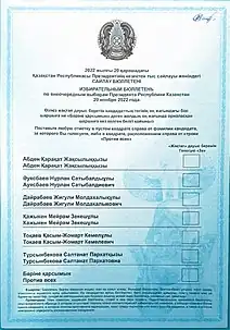 - "A meeting of the Central Election Commission was held on the provision of voter lists to polling stations, approval of the text of the ballot paper and accreditation of international observers". www.election.gov.kz. 31 October 2022. Retrieved 14 November 2022.