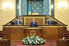 Despite Tokayev's prior pledges for a multi-party system, and expressed hopes for different parties to enter the Parliament,[61][62] the composition of the newly elected 7th Parliament virtually remained the same compared to 2016. The ruling Nur Otan party retained its super-majority control of the lower house, the Mazhilis. The OSCE criticised the election as being uncompetitive and with lack of genuine choice.[63][64] The 2016 legislative elections also saw the return of Dariga Nazarbayeva as an MP, which once again fueled speculations regarding Nazarbayev's post-presidential influence.[65][66] As the 7th Parliament convened on 15 January, Tokayev unveiled a third package of reforms. He pledged to further develop the Kazakh political system, and to strengthen human rights.[67]
