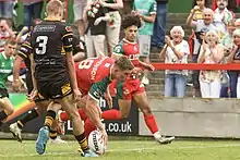 Round 13 was the club's annual pride day game.[39] A fourth clean sheet was recorded as West Wales Raiders were defeated 86–0. Keighley scoring 16 tries with Agoro scoring four tries for the second time in the season and in the process overtaking Charlie Graham's newly set record as Agoro scored for the 10th consecutive match.[40][41]