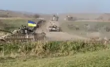 By 4 October, as confirmed by Institute for the Study of War (ISW), several Russian and Ukrainian sources reported that Ukrainian forces captured Davydiv Brid, Mala Oleksandrivka, Velyka Oleksandrivka, Novodmytrivka, Starosiliya, Novomykhailivka, Dudchany on the shore of the Kakhovka Reservoir, Chereshneve, Novovoskresenske, Maiske, Petropavlivka, Trinofivka, Novavasilievka, Chervone, Novohryhorivka, Nova Kamyanka, Pyatykhatky, Sablukivka, and Kachkarivka after Russian forces abandoned them to avoid encirclement on 4 October.[19] A total area of 2,400 square kilometers in the south of Ukraine had been liberated since the beginning of the war.[144] Ukrainian forces reached the village of Novopetrivka.[145] Novovasylivka, Novohryhorivka, Nova Kamyanka, Tryfonivka and Chervone in the Beryslav Raion were officially under the control of Ukrainian forces as late as 12 October.[146][147]