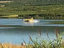 By the morning of 15 July, 3,150 hectares (7,800 acres) had burnt at the La Teste-de-Buch, the fire having reached the lake at Cazaux while 10,000 people had been evacuated so far.[19] The fire was still not under control and at Cazaux three houses and two restaurants had been destroyed.[20] Bulldozers were brought in to attempt to build firebreaks ahead of the fire.[21] Around a thousand firefighters, three Canadairs and one Dash aircraft were being deployed to fight the fires in both areas that morning.[19]