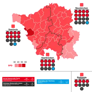 The election was won by the SPD in an historic landslide, capturing a majority in the Landtag and winning at least a plurality in all municipalities of Saarland, largely attributed to the personal popularity of longtime Deputy Minister-President Anke Rehlinger. This election was the first time since the 2017 North Rhine-Westphalia state election that an incumbent Minister-President was defeated for re-election, with the largest margin of defeat since the 2011 Hamburg state election, the first time since the 2013 Bavarian state election that a party received an absolute majority in a Landtag,[1] as well as the first time since 1994 that the SPD did so in the Saarland.