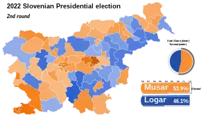 Presidential elections were held in Slovenia on 23 October 2022.[1] Since no candidate received a majority of the vote, a run-off between the top two placing candidates, Slovenian Democratic Party candidate Anže Logar and independent candidate Nataša Pirc Musar, took place on 13 November 2022. Incumbent President Borut Pahor was ineligible to run for a third consecutive term due to term limits.[2] Pirc Musar won the run-off with 53.86% of the vote, becoming the first female president of Slovenia.[3][4]