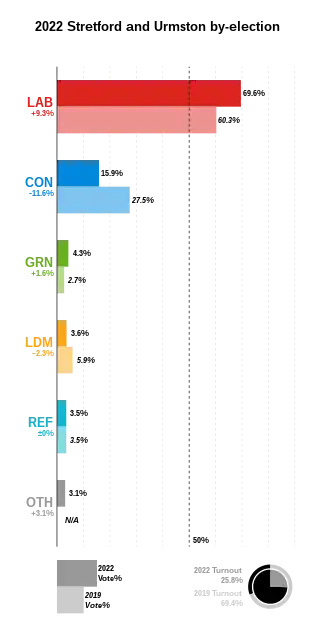 A by-election was held in the United Kingdom parliamentary constituency of Stretford and Urmston on 15 December 2022,[1] following the appointment of sitting Labour MP Kate Green as Deputy Mayor of Greater Manchester.[2][3] Green was appointed as Steward and Bailiff of the Manor of Northstead on 10 November, giving effect to her resignation as a member of Parliament.[4][5]