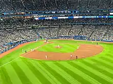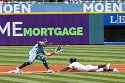 To begin May, the Blue Jays took the final game of the three-game series against the Astros, 3–2.[37] Ending their ten-game homestand, the Jays took on the Yankees. Toronto dropped the first two games of the series, 3–2 and 9–1 respectively, but salvaged the final game 2–1, ending the Yankees' 11-game winning streak and taking their first series loss of the 2022 season.[38][39] The Blue Jays then embarked on a nine-game road trip, beginning with four against the Cleveland Guardians. Rookie Steven Kwan's first home run helped Cleveland to a 6–5 victory in the opener.[40] The second game was rained out, and rescheduled as a doubleheader for the following day. The teams split the games, with Toronto taking the first 8–3 and Cleveland taking the second, 8–2.[41] The Guardians took the series with a 4–3 win in the finale.[42] After a day off, the Blue Jays were swept in a brief two-game series in New York against the Yankees.[43] With a 1–5 record on their road trip, the Blue Jays travelled to Tampa Bay for the first time in 2022, to take on the Rays. Toronto lost the opener, 5–2, which extended their losing streak to five games and lowered their record to 17–16.[44] The Jays ended their losing streak with a 5–1 victory in the second game, before dropping their fourth straight series with a 3–0 loss in the finale.[45][46]