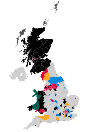 Across Great Britain, the Conservatives had a net loss of 487 seats in comparison to 2017 in Scotland and Wales and 2018 in England, whilst Labour gained 108 seats (22 in England, 20 in Scotland, and 66 in Wales). The Liberal Democrats and Greens made gains of 224 seats and 87 seats, respectively, which exceeded those of the Labour Party in England but were also seen to a more modest extent in Scotland and Wales. The Scottish National Party (SNP) gained 22 seats in Scotland whilst Plaid Cymru made a net loss of 6 seats in Wales.[2]