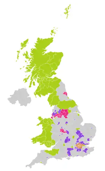 County councils are the upper tier of a two-tier system of local government, with the area each council covers subdivided into district councils with different responsibilities. These are first-past-the-post elections with a mixture of single-member and multi-member electoral divisions. County councils are elected in full every four years, with the last election having been in 2021. However, due to consultations about possible unitarisation, elections for three county councils were postponed to 2022.[16] The government has announced plans to replace the councils with unitary authorities pending Parliamentary approval.[17]