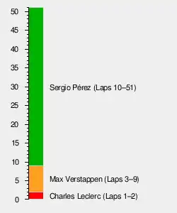 Pérez, Verstappen and Leclerc would be the top three drivers for the rest of the race as Pérez took his second Azerbaijan Grand Prix victory. This was Leclerc and Ferrari's first podium finish of the season.[25] Leading Lando Norris in ninth place by almost 30 seconds, George Russell took advantage of the opportunity to make a late pit stop from eighth for a fresh set of tyres, enabling him to claim a point for fastest lap.