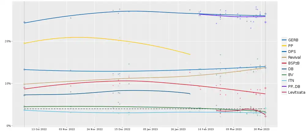 | Polling firm | Fieldwork date | Sample | GERB—SDS | PP–DB | DPS | Revival | BSPzB | BV | VMRO | ITN | IS.BG/ Levitsata! |