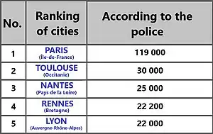 | Strasbourg[44][45] | 10,500 | N/A (18,000 to 20,000 according to media sources) |