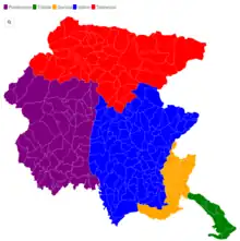 The territory of the region is divided in 5 constituencies: Trieste, Gorizia, Udine, Tolmezzo and Pordenone.