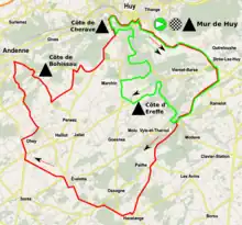 The race started and finished in Huy, with the finish line on the top of the final ascent of the Mur de Huy - one of three ascents of the Mur on the route.[2][3] There were 7 categorised climbs: