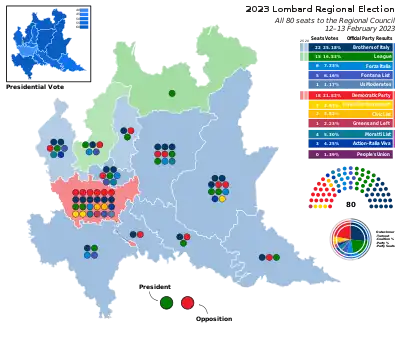 The 2023 Lombard regional election took place on 12 and 13 February 2023. The election took place concurrently with the 2023 Lazio regional election, as decided by the Italian government on 9 December 2022.[2]