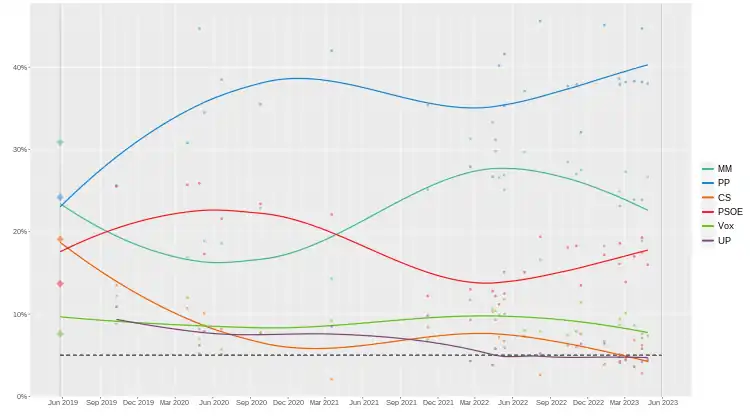 - "Almeida supera en 14 puntos a Más Madrid pero queda lejos de la mayoría absoluta". El Mundo (in Spanish). 15 April 2023.