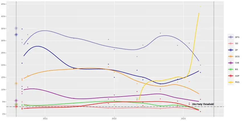 | Feb 2023 | MB/CeDem[lower-alpha 4] | 34.4 | 21.8 | 17.4 | 4.6 | w.DPS | 3.6 | 18.2 | n/a | 12.6 | ||||||||||