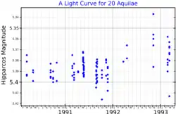 20 Aquilae, abbreviated 20 Aql, is an irregular variable[11] star in the equatorial constellation of Aquila. 20 Aquilae is its Flamsteed designation. It ranges in magnitude from a peak of 5.33 down to 5.36, which is bright enough for the star to be visible to the naked eye.[12] The estimated distance to this star is around 920 light years, based upon an annual parallax shift of 3.5 mas.[2] The star is moving closer to the Earth with a heliocentric radial velocity of −23 km/s.[7]