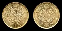 In November 1869, new units of yen were established in the form of a metric system. During this time it was decided that silver would become the standard unit of value leaving gold coinage as a subsidiary.[1] The Japanese government considered adopting the gold standard as early as December 1870 after hearing about its implementation in the United States.[1] This system was officially put into place on May 10, 1871 setting standards for the 20 yen coin.[1] Gold coinage eventually ground to a halt within a few years as coinage regulations that had been put into place were not sufficient to maintain a healthy growth of gold monometallism. This was in part due to the issuance of large amounts of in-convertible paper currency which drove gold coins out of the country.[2] Coinage of the 20 yen piece had all but stopped by 1877, and those struck in 1880 were only done so as part of presentation sets for visiting dignitaries and heads of state.[3]