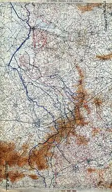 The 91st artillery brigade had moved off from its positions at 10:30 that morning, and despite broken down tanks on the road it was using, was in action that afternoon some 2,500 yards (2,300 m) in front of the old front line.[74] By nightfall the 59th Brigade were established along approximately 2,000 yards (1,800 m) of the line of the canal from Les Rues Vertes east, with one company of the 10th R.B. in the village of Les Rues des Vignes just west of the canal. The K.R.R.C. battalions were stationed in a line south of Les Rue Vertes, and the 60th and 61st brigades were consolidating their positions on the north-eastern end of Welsh Ridge. A night attack by the 11th R.B. to take the canal crossings at Crèvecœur was repulsed.[75] During the day the division had taken over 760 prisoners.[76]