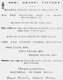 The 1,400-strong 214th Pennsylvania Infantry was organized at Philadelphia in March 1865, with men from that city and the counties of Lancaster and Northampton, under the command of Regular Army officer Colonel David B. McKibbin.[1] It was raised by the Union League for a one-year term of service to replace returning veteran units, and was also known as the 8th Union League Regiment.[2] Though most of the regiment was from Philadelphia, Company H was recruited at Easton in Northampton County.[3] After completing its organization, the regiment left Philadelphia on 8 April[4] for the Shenandoah Valley, where it engaged in guard and provost duty until July as part of the 2nd Brigade, 3rd Division, Army of the Shenandoah. It was ordered to Washington, D.C. to garrison the city as part of the XXII Corps in July, and a detachment under Major Washington M. Worrall was sent to Annapolis to command the post there in November. The regiment was mustered out at Washington on 21 March 1866; it was the last Pennsylvania regiment mustered out.[5] During its service, 24 men of the regiment died of disease.[6]