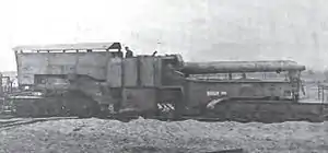 The E. u. B. could fire from any suitable section of track after curved wedges were bolted to the track behind each wheel to absorb any residual recoil after the gun cradle recoiled backwards. It also had a pintle built into the underside of the front of the mount. Two large rollers were fitted to the underside of the mount at the rear. Seven cars could carry a portable metal firing platform (Bettungslafette) that had a central pivot mount and an outer rail. It was assembled with the aid of a derrick or crane, which took between three and five days, and railroad tracks were laid slightly past the firing platform to accommodate the front bogies of the gun. The gun was moved over the firing platform and then lowered into position after the central section of rail was removed. After the gun's pintle was bolted to the firing platform's pivot mount, the entire carriage was jacked up so that the trucks and their sections of rail could be removed. The carriage was then lowered so that the rear rollers rested on the outer track. Concrete versions were also used. It could have up to 360° of traverse. The E. u. B. retained 2° 15' of on-mount traverse for fine aiming adjustments.[3]