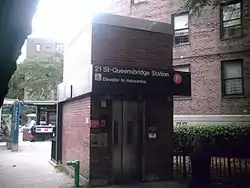 The 21st Street–Queensbridge station is a station on the IND 63rd Street Line of the New York City Subway. Located at the intersection of 21st Street and 41st Avenue within Queensbridge in Long Island City, Queens, it is served by the F train at all times and the <F> train during rush hours in the reverse peak direction.