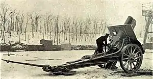 ![]() A mle 1915/1916 at maximum elevation. Notice the pit dug to allow the gun to recoil. | |