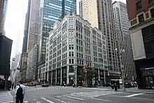 GM continued to use the Argonaut Building as a showroom, opening a Cadillac and LaSalle showroom on the ground level in 1935.[41][42] At that point, vehicle elevators between the basement and the third floor were installed.[37] According to the building's subsequent owners, the first built-in car radios were sold inside the showroom in 1938.[43] During the 1940s, the Automobile Merchants Association took space in the building,[44][45] as did the United States Office of War Information[6] and the Voice of America.[46] The Voice and the Office of War Information had leased all of the office floors during World War II, but GM retook most of the space after the end of the war.[47] The second and third floors of the Argonaut Building became office space in 1964, and the ground-level showroom operated through the late 1970s.[37] Although General Motors completed a new headquarters and showroom building at 767 Fifth Avenue in 1968,[48] GM stated that it would retain the Argonaut Building after the completion of the new structure.[49] By the 1970s, GM had moved its divisions in the Argonaut Building to other locations.[34]