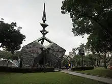 The 228 Memorial Monument was designed by Taiwanese architect Cheng Tzu-tsai,[8] who was convicted of attempted murder in 1971 following a 1970 assassination attempt on Chiang Ching-kuo.[9] After serving his sentence, he was imprisoned for illegal entry to Taiwan in 1991[10] and filed his design entry from prison.[11] The Monument is inscribed with an exhortation for peace and unity.[12]