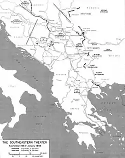 In September it returned to 75th Corps, which was now assigned to the 57th Army of 3rd Ukrainian Front.[58] On the night of September 8, after forces of the Front, led by the 57th, crossed its border, the government of Bulgaria also went over to the Allies. The Army moved west, south of the Danube, linking to the mobilizing Bulgarian armies to its south, approaching the border of Yugoslavia by September 19 and crossing the river into the bend west of Turnu Severin on the 22nd. The German Army Group F sent the 1st Mountain Division to oppose this move but it could only impose a delay. On October 4 Soviet forces reached Pančevo on the north bank of the Danube 16 km downstream from Belgrade and on the 8th the railroad running into the city from the south was cut. On the night of October 14 a combined force of Soviet troops and Yugoslav partisans entered Belgrade and took the city center by the next afternoon.[59] For this feat another regiment of the division was awarded a battle honor: