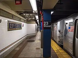 The 23rd Street station is a local station on the BMT Broadway Line of the New York City Subway. Located at the intersection of 23rd Street, Broadway, and Fifth Avenue in the Flatiron District of Manhattan, it is served by the R train at all times except late nights, the W train on weekdays, the N train during late nights and weekends, and the Q train during late nights.