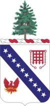 Insignia on Shield: Portcullis is upper right. In ancient fortress warfare the portcullis barred the gateway to the hostile invader. Its color (red) symbolizes the artillery. The phoenix in the lower left is the crest of the City of Portland, the seaport and chief gateway of Maine. It represents the city (formerly named Falmouth) rising from its ashes after being destroyed by fire three times; by the Indians in 1676, by the French in 1690, and by the English fleet in 1775.[10] It is also the crest of the Harbor Defenses of Portland to which the regiment was assigned for service. It further denotes the successive rebirths of the regiment following the civil, Spanish, and World wars. The ten stars running from upper left to lower right represent the ten major battles engaged in by the Regiment. The blue band serving as background for the stars signifies the intermittent existence of the regiment as infantry, especially during the Civil War.[9]