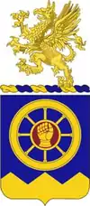 On the coat of arms, there is a crest above the shield. The crest consists of a golden and blue wreath on which stands a gold griffin. Atop the distinctive unit insignia is a brick red scroll inscribed "Wolf Hounds" in gold.