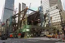 In July 2019, the MTA and JPMorgan Chase signed an agreement, in which JPMorgan agreed to ensure that the destruction of 270 Park Avenue would not disrupt the timeline of East Side Access.[30] The same month, scaffolding was wrapped around the tower and podium structure on the Madison Avenue side of the building, marking the beginning of building demolition. At the time, demolition was scheduled to be completed at the end of 2020.[31] By late December 2020, the demolition of the main tower had not yet been completed, but parts of the new superstructure were being assembled on the Madison Avenue side, as demolition on the podium structure had been completed earlier.[32] The first steel beams of the new structure were being assembled by the following month, in January 2021, three months before demolition of the main tower concluded.[33]
