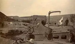 Due to a lack of alternatives, the Japanese reactivated the 28 cm howitzer for coastal defence in 1945, expecting the landing of the Allies. Thirteen guns were emplaced on Kyushu, six on Shikoku, 62 on Honshu and 10 on Hokkaido.[7] Also, two batteries of the 28 cm howitzers were used by 132nd Independent Mixed Brigade at Dongning, Heilongjiang, during the Soviet invasion of Manchuria in 1945.[8] Two batteries of 28 cm howitzers were emplaced with the Najin Fortress Garrison in Rason.