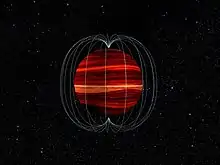 The wind speed is directly inferred from minute, regular cycles in its visible (which matches its ultra-violet) appearance compared to the same at radio wave spectra.[6][7][8][9] The radio emissions are coming from electrons interacting with the magnetic field, which is rooted deep in the interior.[8] The visible and infrared (IR) data, on the other hand, reveal what's happening in the gas giant's cloud tops.[8]
