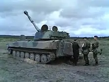 The 2S1 Gvozdika (Russian: 2С1 «Гвоздика», "Carnation") is a Soviet self-propelled howitzer introduced in 1972 and in service in Russia and other countries as of 2023. It is based on the MT-LBu multi-purpose chassis, mounting a 122 mm 2A18 howitzer. "2S1" is its GRAU designation. An alternative Russian designation is SAU-122, but in the Russian Army it is commonly known as Gvozdika. The 2S1 is fully amphibious with very little preparation, and once afloat is propelled by its tracks. A variety of track widths are available to allow the 2S1 to operate in snow or swamp conditions. It is NBC protected and has infrared night-vision capability.