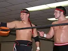 On June 27 3.0 picked up their first point by defeating F.I.S.T. (Chuck Taylor and Icarus) and followed that up with a victory over the Super Smash Bros. (Player Uno and Player Dos) on August 28.[50][51] The following day 3.0 defeated the House of Truth (Christian Abel and Josh Raymond) to earn their third point and first shot at the Campeonatos de Parejas.[52] Parker and Matthews received their shot at the following event on September 18, 2010, in a Chikara tradition, a Two Out of Three Falls match, against the defending champions, Ares and Claudio Castagnoli of the Bruderschaft des Kreuzes (BDK). BDK won the first fall in quick fashion thanks to a pre-match assault from BDK member Delirious.[53] However, Parker managed to tie the score by pinning Castagnoli with a flash roll-up, the first time BDK had dropped a fall in their title matches.[53] Despite having the entire Chikara locker room by ringside cheering 3.0 on, BDK managed to win the third fall, when Castagnoli forced Matthews to submit with the Inverted Chikara Special, and retained the Campeonatos de Parejas.[53] 3.0. earned another three points on February 20, 2011, in a four-way elimination tag team match, after eliminating Los Ice Creams (El Hijo del Ice Cream and Ice Cream Jr.), but lost the points after being eliminated themselves by BDK members Daizee Haze and Delirious, after a distraction from the UnStable (Vin Gerard and STIGMA), from whom Parker and Matthews had earned their second point the previous day.[54] For the 2011 King of Trios, 3.0 came together with El Generico to form ¡3.0lé!. On April 15, the team was eliminated from the tournament in the first round by The Osirian Portal (Amasis, Hieracon and Ophidian).[55][56] On May 21, 3.0 ended their three-month-long feud with the UnStable by defeating them in a tag team match, where the losing team had to split up.[55] In early 2012, 3.0 earned another shot at the Campeonatos de Parejas by picking up three points with victories over The Bravado Brothers (Harlem and Lancelot), BDK (Jakob Hammermeier and Tim Donst) and the Throwbacks (Dasher Hatfield and Mark Angelosetti).[55] On March 24 in Vaughan, Ontario, 3.0 defeated F.I.S.T. (Chuck Taylor and Icarus) in the main event of Chikara's first ever event in Canada to become the new Campeones de Parejas.[57] On April 29, 3.0 lost the Campeonatos de Parejas back to F.I.S.T. in their first title defense, ending the team's reign at just 36 days.[57] Following their title loss, 3.0 started feuding with the Bravado Brothers, who were blamed for injuring Parker's rib prior to the loss.[58] The rivalry built to a grudge match on June 23, where 3.0 was victorious, earning their second point in the process.[59] Also in June, 3.0 began regularly teaming with Gran Akuma in six man tag team matches.[60] On August 17, 3.0 earned their third point by eliminating Arik Cannon and Darin Corbin from a four tag team elimination match. However, later that same match, the Bravado Brothers eliminated 3.0, costing their rival team all of their points and a match for the Campeonatos de Parejas.[61] On September 14, 3.0 and Gran Akuma entered the 2012 King of Trios tournament, but were eliminated in their first round match by The Batiri (Kobald, Kodama and Obariyon).[55][62]