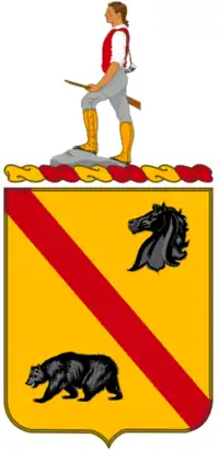 After the United States entered World War II, it was converted into the 62nd Tank Destroyer Battalion on 30 January 1942. The battalion was disbanded on 11 November 1944.[1][2] An unrelated reserve unit, the 302nd Armored Cavalry Regiment, briefly existed after the war in New York.[5] The 302nd was reconstituted on 1 January 1971 in the Army Reserve, with the 1st Squadron activated on the same day at Kearny, New Jersey, with the 78th Division (Training). It was inactivated at Kearney on 30 June 1973. On 1 August, the 1st and 2nd Squadrons were activated and assigned to the 100th Division (Training), with the 1st Squadron at Frankfort, Kentucky, and the 2nd Squadron at Georgetown, Kentucky.[1] The 1st Squadron along with the division was called to active duty in 1991 to train armored cavalry scouts for the Gulf War.[6][7] The regiment's units were inactivated by the mid-2000s when the 100th Division restructured changed its mission from initial entry training to provide specific Military Occupational Specialty training to four MOSs.[8]