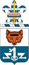 "White and teal blue, are symbolic of the battalion's former status as an unassigned-to-branch unit. The battalion's war service as a signal unit is shown by the colors of the fox's mask and background, while the intelligence functions of the unit are represented by the black censor's stamp. The key is for the unit's first campaign (Normandy) in World War II and also alludes to signal and intelligence functions. The stylized lightning flashes symbolize radio reconnaissance."[6]