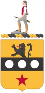 The 305th's coat of arms was approved on 29 October 1924, and its distinctive unit insignia was approved on 30 January 1925. Both were rescinded on 2 February 1959. The distinctive unit insignia included a 1 1/8 in (2.86 cm) gold colored metal and enamel device, which consisted of a yellow shield divided by a black stripe with three plates in the center. A lion rampant was depicted above the stripe, and a red star with yellow border below it. The shield's color symbolized the cavalry, the stripe and lion were taken from William Penn's coat of arms, and the red star symbolized the 305th's initial organization in Texas and its artillery service. The regimental coat of arms was of a similar design to the distinctive unit insignia but included the Organized Reserve's Minuteman crest above the shield.[6]