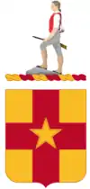 The 307th's distinctive unit insignia was approved on 11 January 1927, and its coat of arms was approved on the next day. Both were rescinded on 17 February 1959. The distinctive unit insignia included a 1 1/8 in (2.86 cm) gold colored metal and enamel device, which consisted of a shield with a red cross with a yellow star in the center, and a red and gold scroll below the shield, which was inscribed with the regimental motto, "Perseverandum". The shield symbolized the United States Cavalry, the cross, similar to that on the colonial seal of Virginia, represented the unit's Virginia assignment, the red symbolized its World War I field artillery service, and the star represented service in Texas. The motto was Latin for "Persevering", and was based on the motto on the reverse of the Great Seal of Virginia. The 307th's coat of arms was similar to the distinctive unit insignia except that it added the Organized Reserve crest, a Minuteman, and omitted the motto.[5]