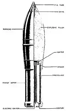 The warhead of the 30 cm Wurfkörper 42 Spreng was ovoid in shape and internally threaded for a nose fuze and filled with either TNT or incendiary mixture. The motor section consists of a threaded tubular section which screws into the warhead. The tail of the tube was threaded and a circular plate with eighteen venturis screwed into the tube. The venturis were drilled at a 12° 42' angle and the exhaust gasses spin stabilized the projectile. The motor was composed of seven sticks of solid-rocket fuel composed of nitrocellulose and diglycol dinitrate weighing 15 kg (33 lb) which was suspended from an internal grid. The center stick contains a length of quick match in a celluloid tube and ignites the six outer propellant sticks. The motor is essentially a scaled up 15 cm Wurfgranate 41.[1]
