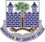 Symbolism: The hornet's nest, adapted from the crest of the North Carolina ARNG, is a reference to the unit's home area. The fleurs-de-lis represent the unit's participation in five campaigns in Europe during World War II, while the sword with blade in the colors of the Belgium Fourragére refers to that award received for service in Belgium and the Ardennes. The laurel branch and the star denote awards of the French Croix de Guerre with Palm and with Star for service in France during World War II; the scarlet scroll alludes to the Meritorious Unit Commendation.[28]