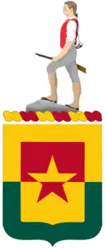 The 313th's coat of arms was approved on 12 October 1925 and its distinctive unit insignia was approved on 5 August 1927. Both were rescinded on 2 February 1959. The distinctive unit insignia included a 1 1/8 in (2.86 cm) gold colored metal and enamel device, which consisted of shield with a half yellow, half green border. The center of the shield included a counterchanged red and yellow star. The colors of the shield symbolized the regiment's service as cavalry, artillery, and then cavalry. The star represented Texas, where it was organized, and the green and yellow border represented its service on the southwestern border. The regimental motto, "We Also Serve", was attached to the bottom of the distinctive unit insignia. The regimental coat of arms was of a similar design to the distinctive unit insignia but included the Organized Reserve's Minuteman crest above the shield and omitted the motto.[6]