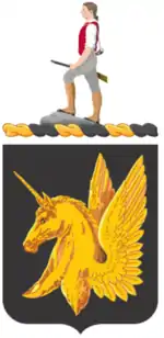 The regiment's coat of arms was approved on 21 March 1924 and its distinctive unit insignia was approved on 20 December. Both were rescinded on 10 February 1959. The distinctive unit insignia was a 1+1⁄8 inches (2.9 cm) gold colored metal and enamel device. It included a black shield depicting the golden head and wings of a unicorn. The regimental motto, "Audax Et Vigilans" (Daring and Vigilant), was attached on a scroll to the bottom of the insignia. The unicorn symbolized continued loyalty to duty and obligation and faithfulness to the service and the country. Its coat of arms was similar to the distinctive unit insignia except that it added the Minuteman crest of the Organized Reserve and omitted the motto.[5]